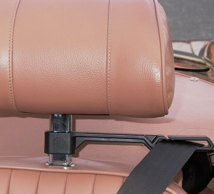 MG Seat Belt Guides for '70 on MGB & later MG MidgetThis Guide keeps your shoulder strap properly over your shoulder instead of chafing against your neck or even falling off your shoulder. It also keeps your strap ready to grab when getting into your MG.Made of tough but flexible black plastic with UV inhibitors for long life. Installs by removing your head rest and simply sliding on for a friction fit. No tools required. Guide can also be modified for snap- on installation if your head rest is frozen. Quality US manufactured product.